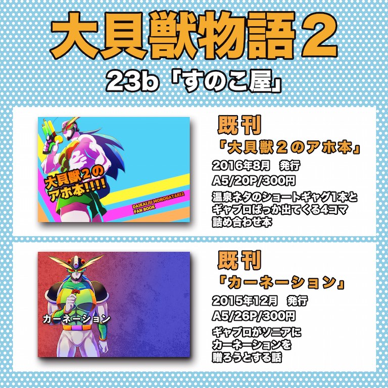 既刊の「カーネーション」「大貝獣2のアホ本」を頒布する予定です!
